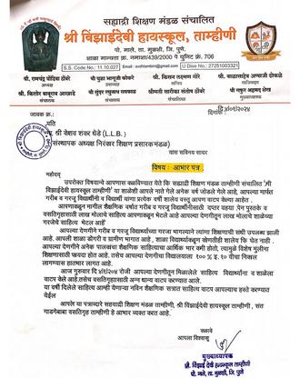 समाजातील प्रत्येक आदरणीय व्यक्तींना मी सांगू इच्छितो की माझ्या संस्थेच्या मुलांना आलेली प्रत्येक शैक्षणिक साहित्य मदत हि त्यांना मिळालेली असते आणि त्यांना देऊन उरलेले शैक्षणिक साहित्य मी समाजातील इतर गरीब व होतकरू विद्यार्थ्यांना वाटत असतो आणि याचे सर्व श्रेय माझ्या संस्थेला मदत करणारे आदरणीय देणगीदार यांना जाते. या बद्दल आम्ही सर्व जण त्यांचे मनापासून आभार मानतो.