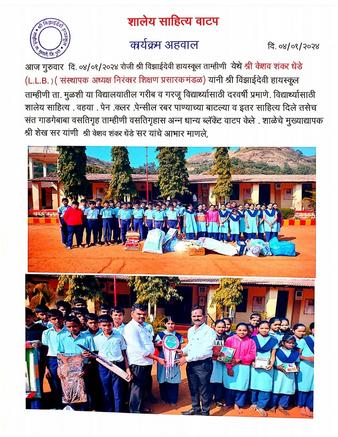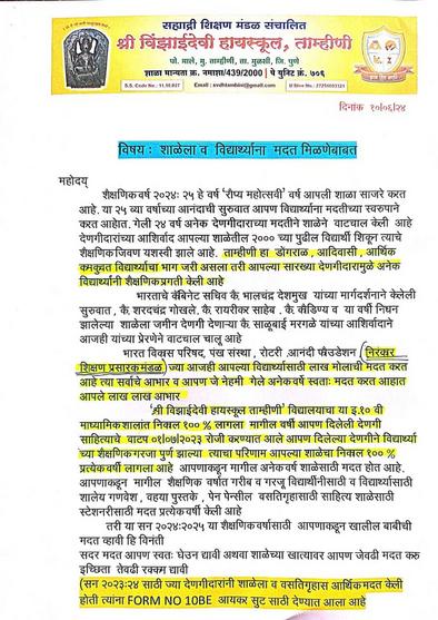 नमस्कार आज संस्थेच्या कामानिमित्ताने दापोली येथे जाताना " श्री विंझाईदेवी हायस्कूल,ताम्हिणी, मुळशी या शाळेत माझ्या संस्थेच्या वतीने वस्ती ग्रहातील मुलांना तसेच विद्यालयातील आदिवासी, कातकरी तसेच शेतकरी यांचे गरीब कुटुंबातील विद्यार्थ्यांना शैक्षणिक साहित्य आणि वस्ती ग्रहातील मुलांना अन्नधान्य यांच्या स्वरुपात माझ्या संस्थेच्या वतीने पुन्हा एकदा प्रत्यक्षात भेट देऊन मदत केली आहे.माझ्या संस्थेच्या वतीने विद्यार्थ्यांना मदत देताना प्रत्यक्ष त्या मुला मुलींच्या चेहर्यावर जो आनंद आणि शैक्षणिक साहित्य मिळाल्याचे समाधान दिसत होते ते मी शब्दात व्यक्त करु शकत नाही. मला त्यांच्या बरोबर फोटो काढताना मनाला एक समाधान वाटले की खरोखरच गरजू विद्यार्थ्यांना आपण मदत पोहोच केली आहे. विद्यालयातील माझे आदरणीय मुख्याध्यापक श्री. गफुर सय्यद सर आणि त्यांचे इतर आदरणीय शिक्षक आणि कर्मचारी वर्ग यांना खूप आनंद झाला होता माझ्या मदतीमुळे.