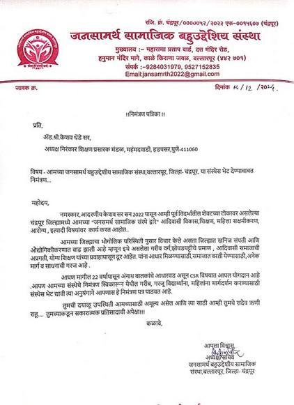 "जनसामर्थ सामाजिक बहुउद्देशीय संस्था" बल्लारपूर, जिल्हा - चंद्रपूर येथील संस्थेचे सचिव माझे आदरणीय सहकारी मित्र श्री. पंकज परशूराम गणवीर आणि आदरणीय अध्यक्ष सौ. अश्विनी घनश्याम कोल्हेकर यांच्या कडून निमंत्रण मला मिळाले आहे. या संस्थेच्या आसपासच्या परीसरातील,गावातील सामाजिक, आर्थिक आणि शैक्षणिक परीस्थितीची पाहणी करुन संस्थेच्या माध्यमातून तेथील लोकांना काही मदत होईल का आणि एखादा सामाजिक उपक्रम राबवून लोकांचे जीवन सुधारण्यासाठी काही करता येईल का यासाठी मला निमंत्रण मिळाले आहे या बद्दल माझी संस्था खूप भाग्यशाली आहे.